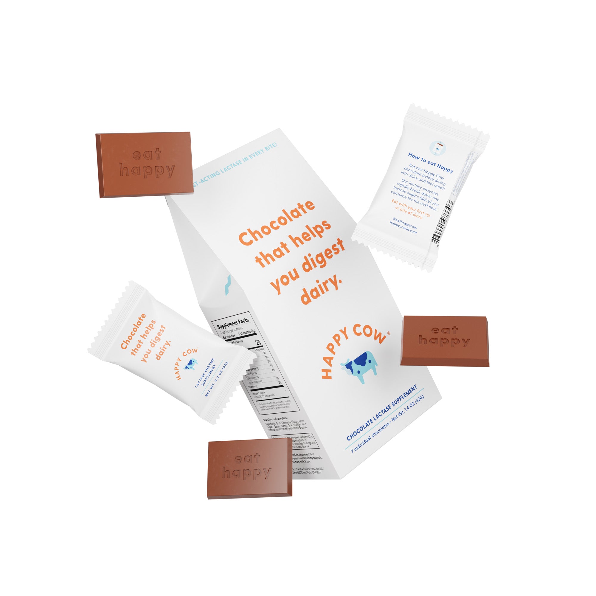 Eat one fast-acting Happy Cow chocolate with your first sip or bite of dairy and feel great. Our natural lactase enzymes prevent gas, bloating, and discomfort by rapidly breaking down any lactose sugars in the dairy products you consume for the next hour.